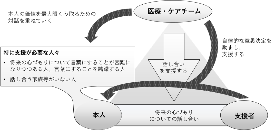 特に将来の心づもりについて言葉にすることが困難になりつつある人、言葉にすることを躊躇する人、話し合う家族等がいない人に対して、医療・ケアチーム等はその人に適した支援を行い、本人の価値観を最大限くみ取るための対話を重ねていく必要があります。